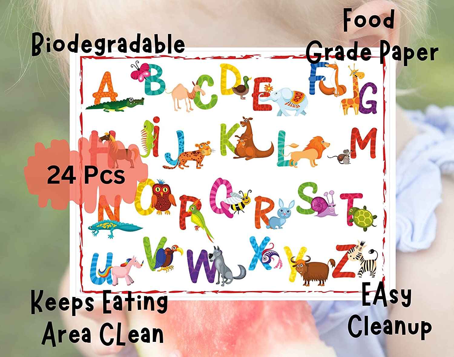 - FUN ANIMALS ALPHABET DESIGN - Babies and kids love animals so much! Start the education process early with our baby disposable placemats by introducing the alphabet with these colorful 11x14 table mat for toddlers.