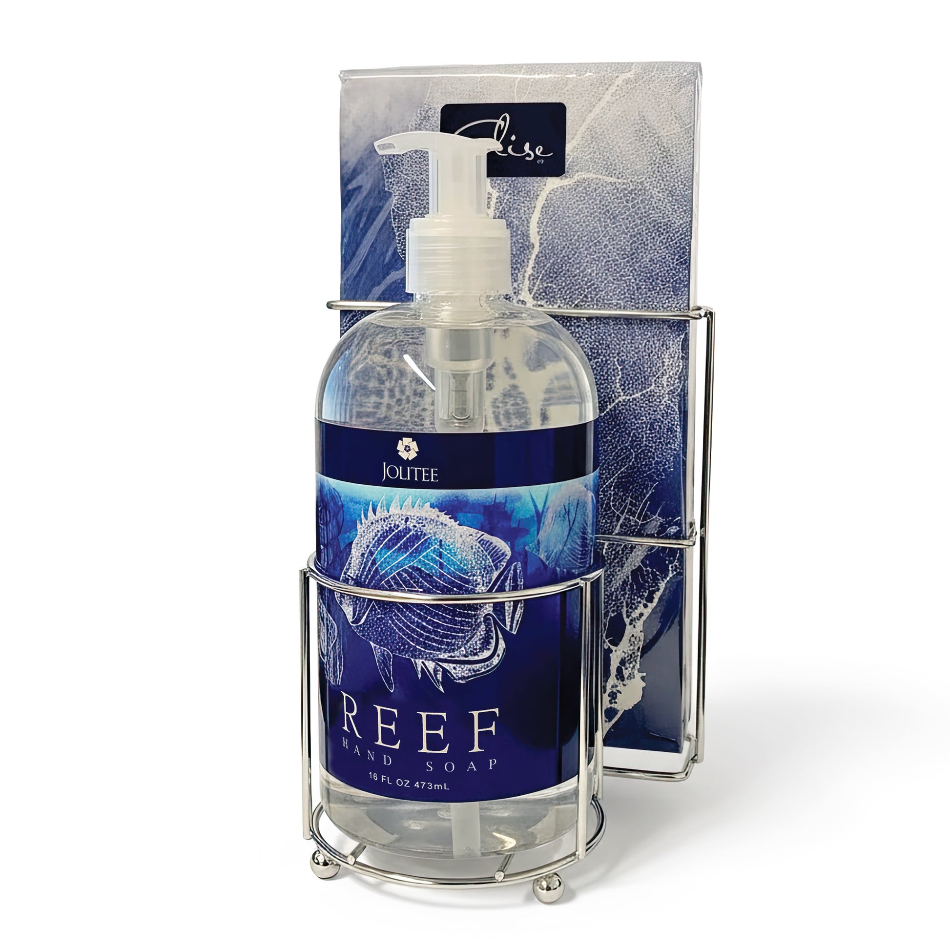 - BATH & KITCHEN ACCESSORIES SET: Three piece set of Reef scented liquid soap in sea salt pure scent and coordinating paper guest towel that fit perfectly into the included silver wire organizer
